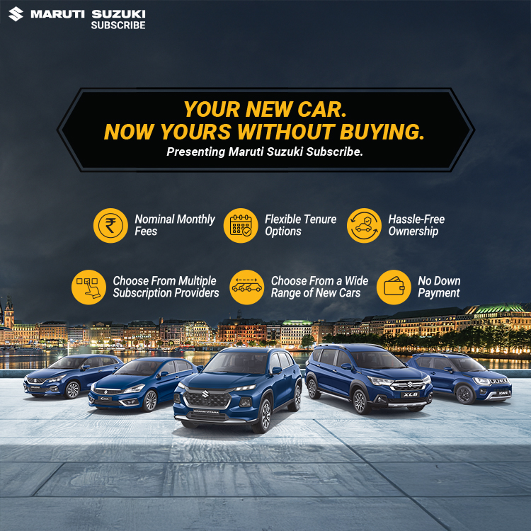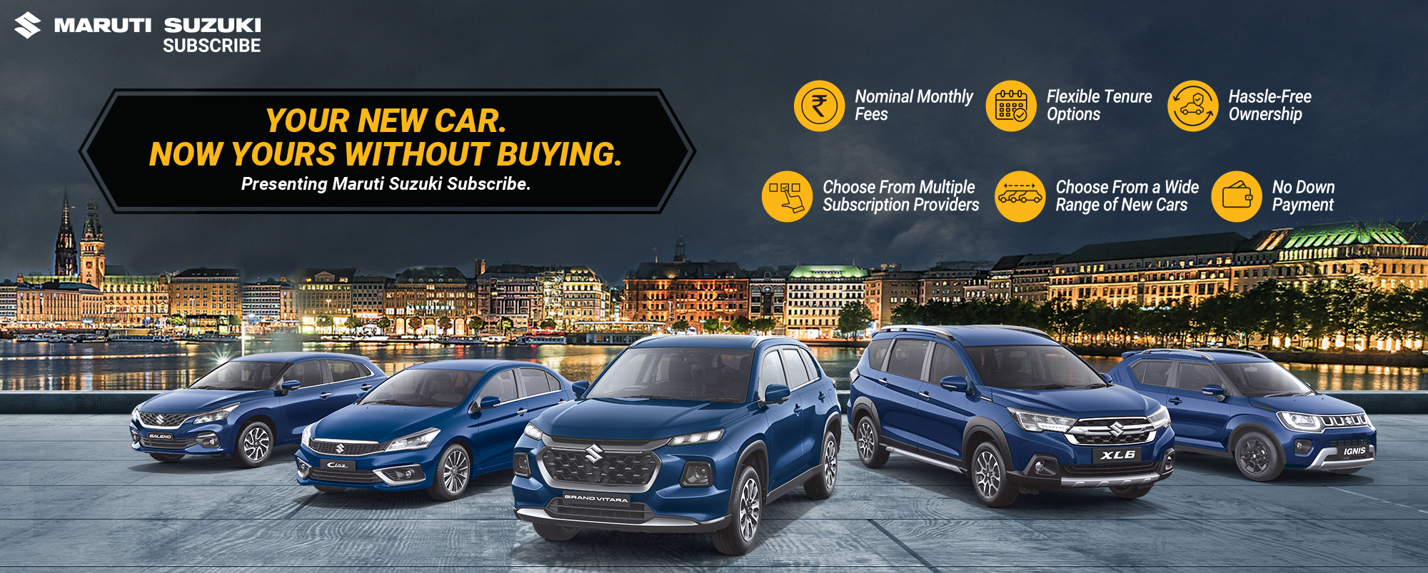 Maruti Suzuki Subscribe enables all customers to enjoy driving their preferred Maruti Suzuki cars without having to deal with all the financial responsibilities that come with owning a car.All you need to do is opt for a monthly subscription plan at a fixed monthly fee, which includes the routine maintenance and insurance costs, and choose a flexible tenure. At Kiran Motors in, , Ahmedabad, all Hatchback, Sedan, SUV, the MUV models line-up includes Baleno, Invicto, EVitara, Jimny, Ciaz, Ignis, Fronx, Grand Vitara, XL6. Here, you will enjoy Maruti Suzuki Subscribe benefits such as: